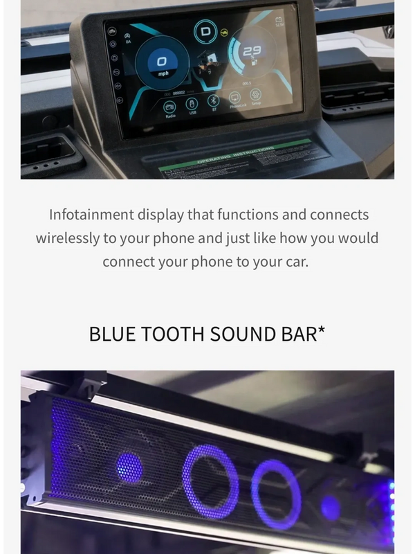 These all new Breezy EV Come with the sound bars with LED light and Bluetooth. As well as a Touch Screen that has Apple & Android CarPlay!